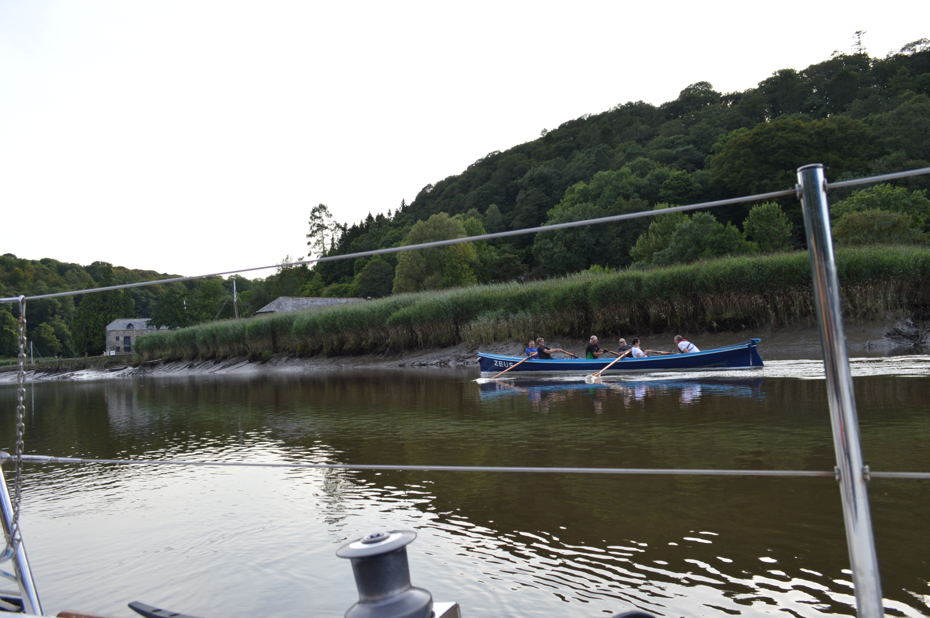 I put my head out of the companionway just as they race past – a male crew racing a female crew.