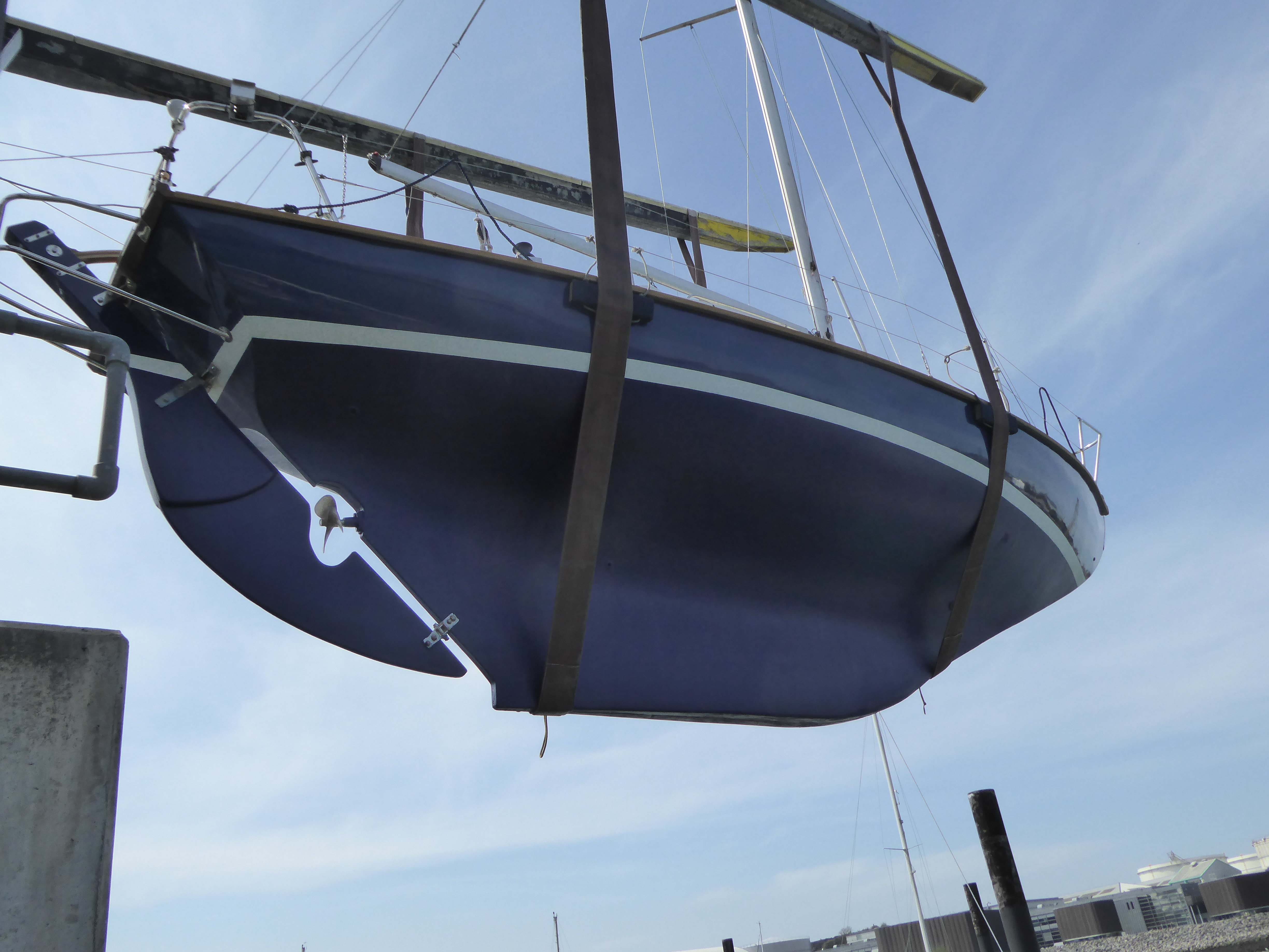 There is no choice but to watch patiently as precious tons of painstaking work is trusted to a Wiggins Marina Bull LoPro and two men who spend their working day moving large, expensive, cumbersome yachts as if they were babes in arms. To them my little boat was a simple job before lunch. to me it was a spell-binding and occasionally heart-stopping trial. I have watched it before, it doesn’t get any easier.