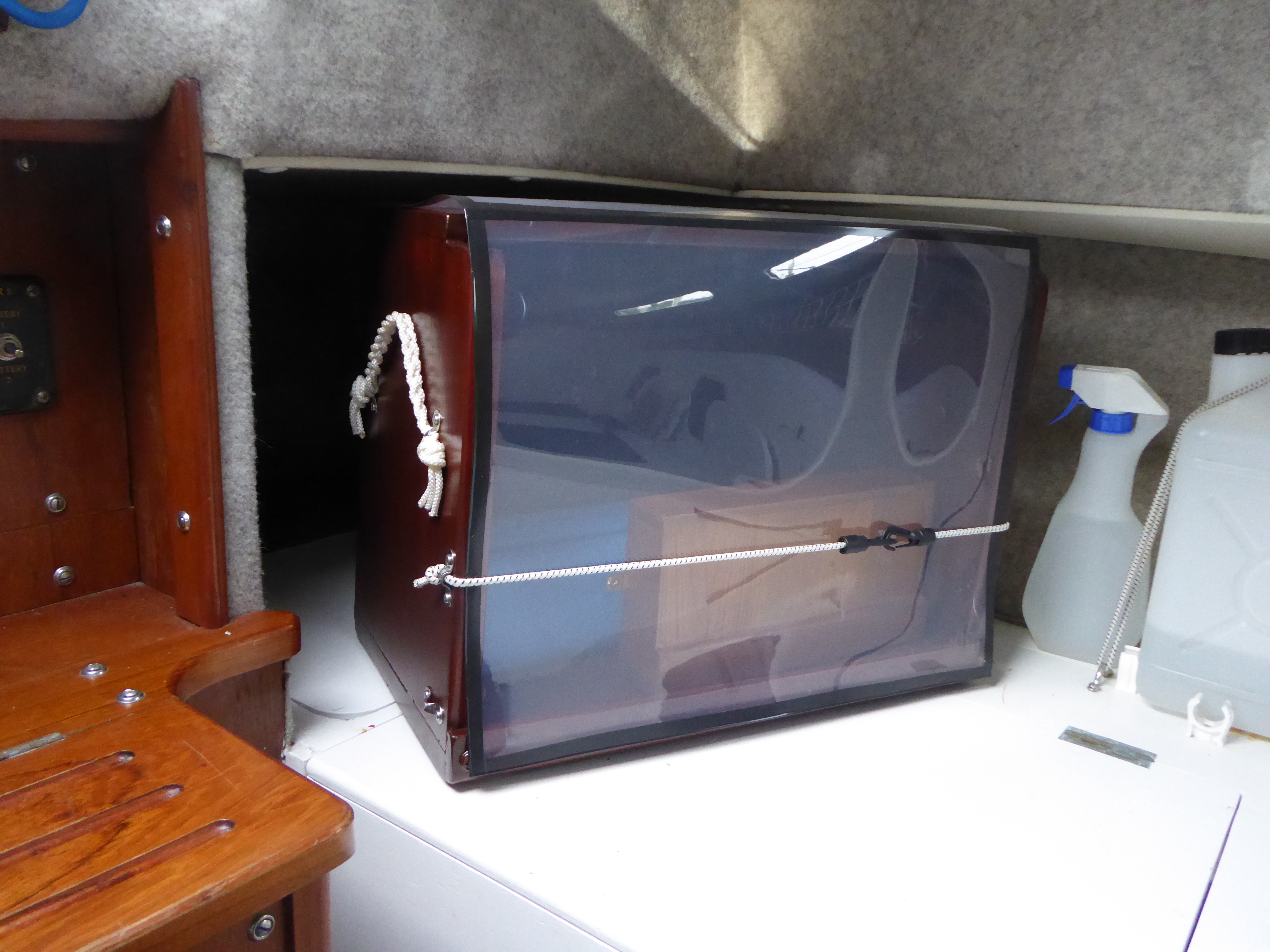 I took out the two-burner origo stove. It was a very good stove, but I didn’t need two burners and it took up space. The Jetboil is very efficient – boiling a cup of water in approximately one minute. The canister is locked on a stand bolted to the board. The whole lot can be removed. There is a small camping stove stowed in one of the lockers if I ever want the luxury of two burners while at anchor.