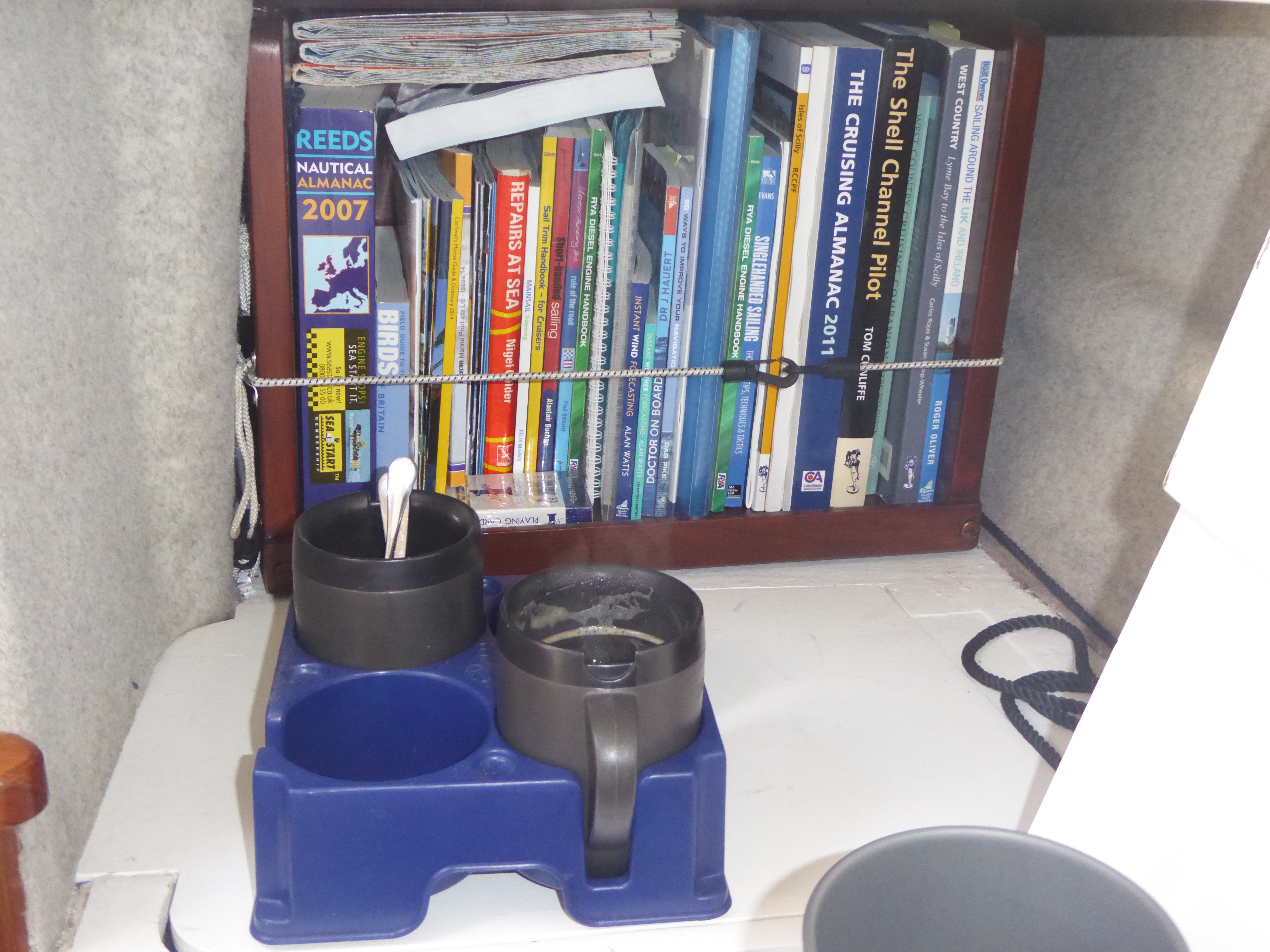 This is not primarily a post about boats but about making a small living space more conducive. When at anchor, I want a degree of ‘luxury’ – to be able to read comfortably, which means having a book shelf somewhere near at hand, and to write ‘sitting up’ at the cabin table. I think I have solved the problem, albeit quirkily, at this winter’s refit.