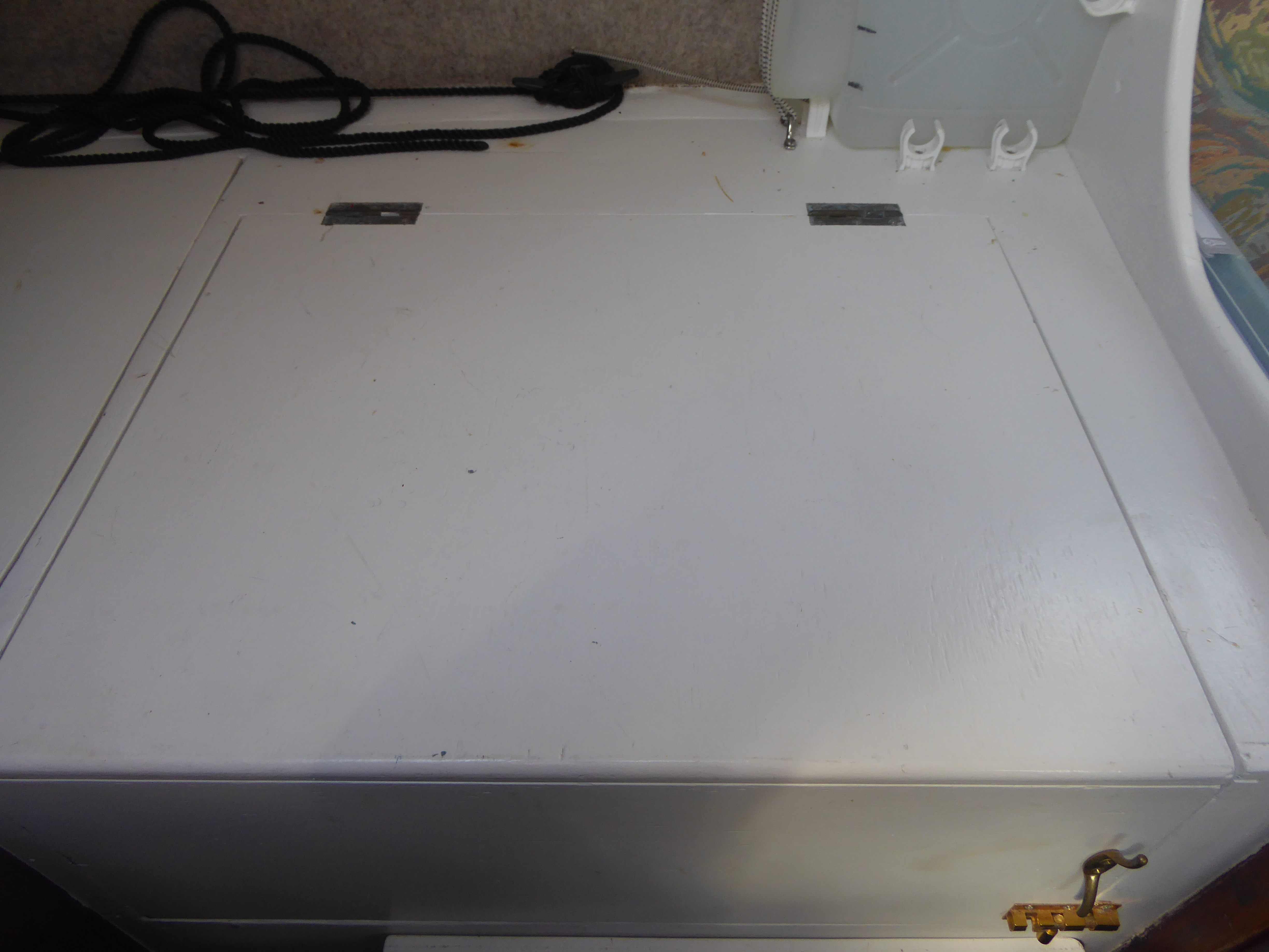 The cabin table is fitted athwartships and bolted into the starboard lockers. It’s a good table and fine for everything except sitting up and writing.