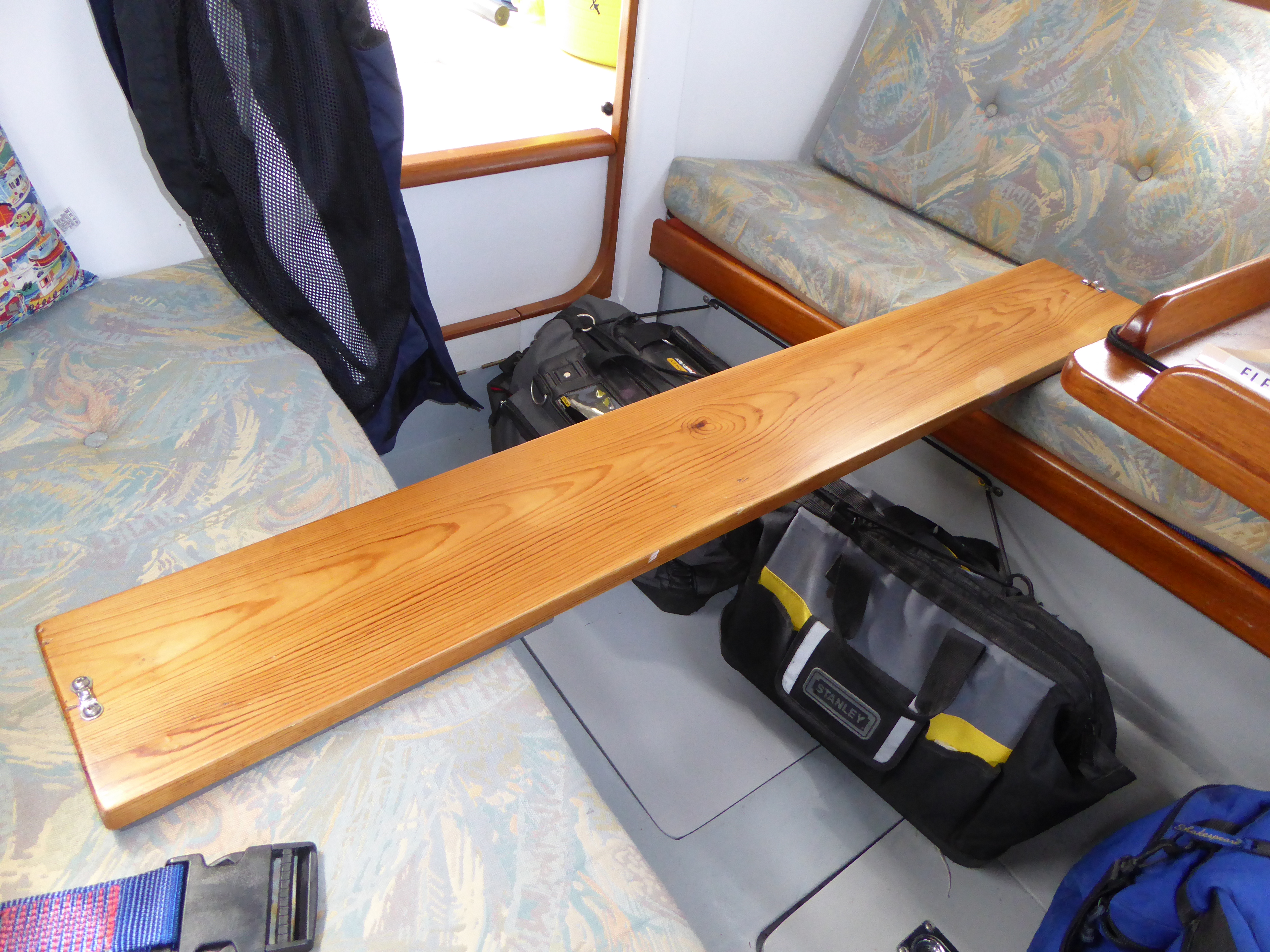 Looking through the this-might-come-in-useful-sometime stack at the back of my shed, I found a varnished shelf that had done twenty years fine service as a book-shelf in our previous house. This might do – it would be helpful to place some self-adhesive insulation tape on the bottom to cushion it from the trim round the seats and to keep it steady – and why not add a couple of eyes at either end to lash it down if needed?