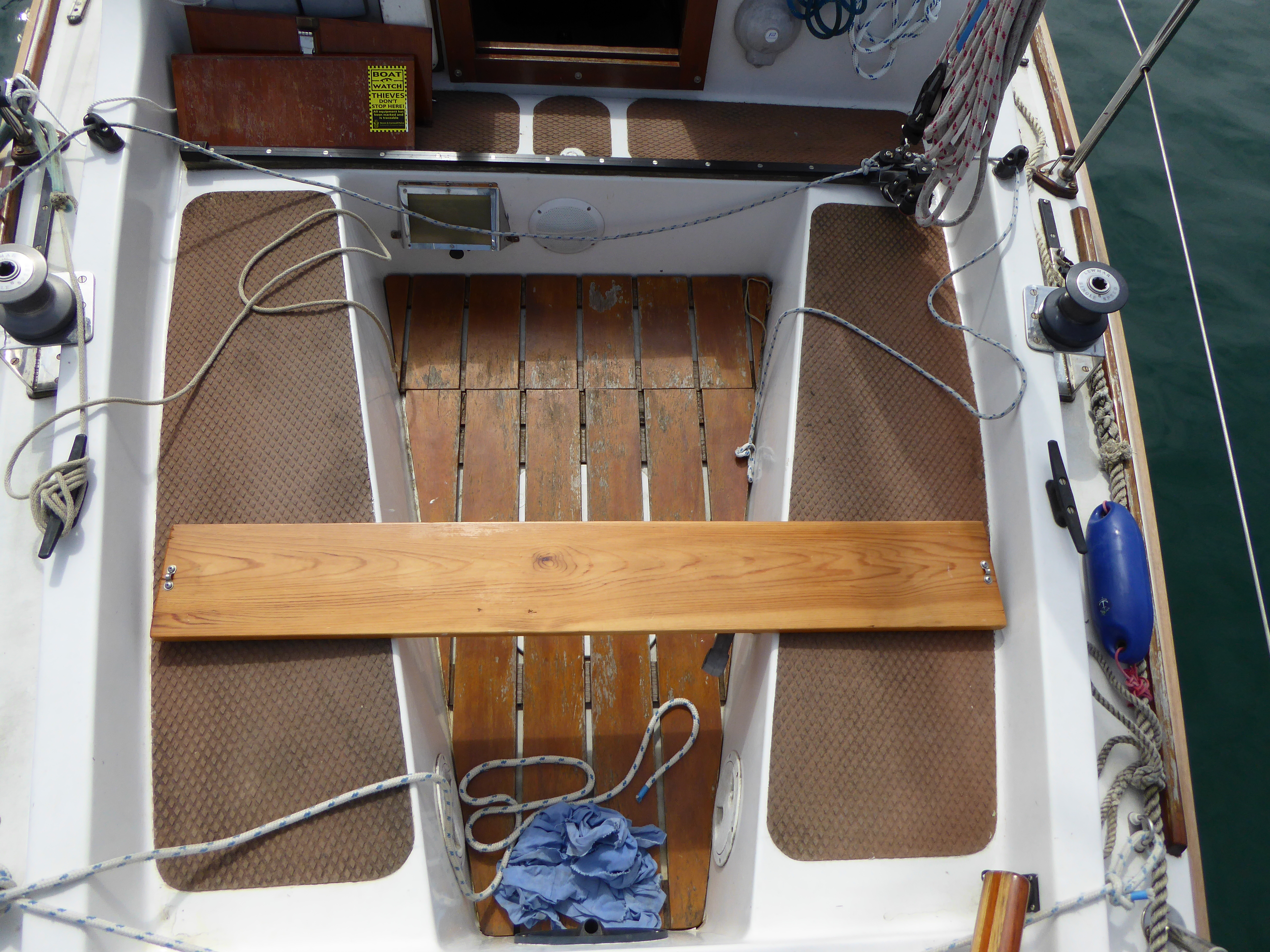 I had spent the afternoon kneeling on the cabin sole, cleaning first the bilge then the lockers and getting frustrated because every time I tried to put something down, it either fell into the bilge, or into the open locker. I wished for a working surface to put tools on and to hammer/screw/cut on, one that would be easy to manage in a relatively restricted space. Too wide and it would be difficult to stow, too narrow and I wouldn’t be able to attach a vice, too short and it wouldn’t fit across the cockpit/cabin sole.