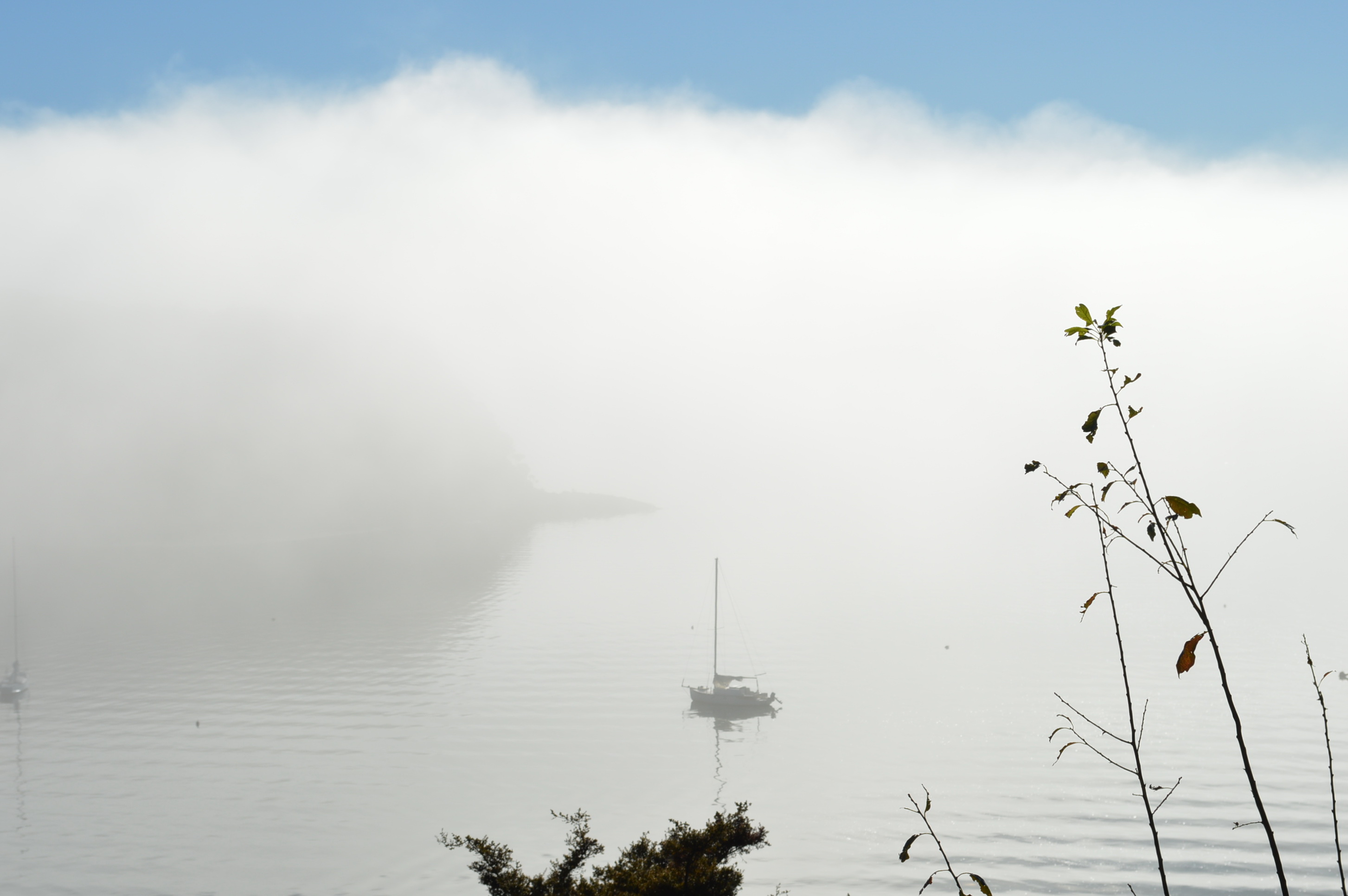 The mist burnt off quickly in the middle of the bay. There is a kite being towed in the third image.