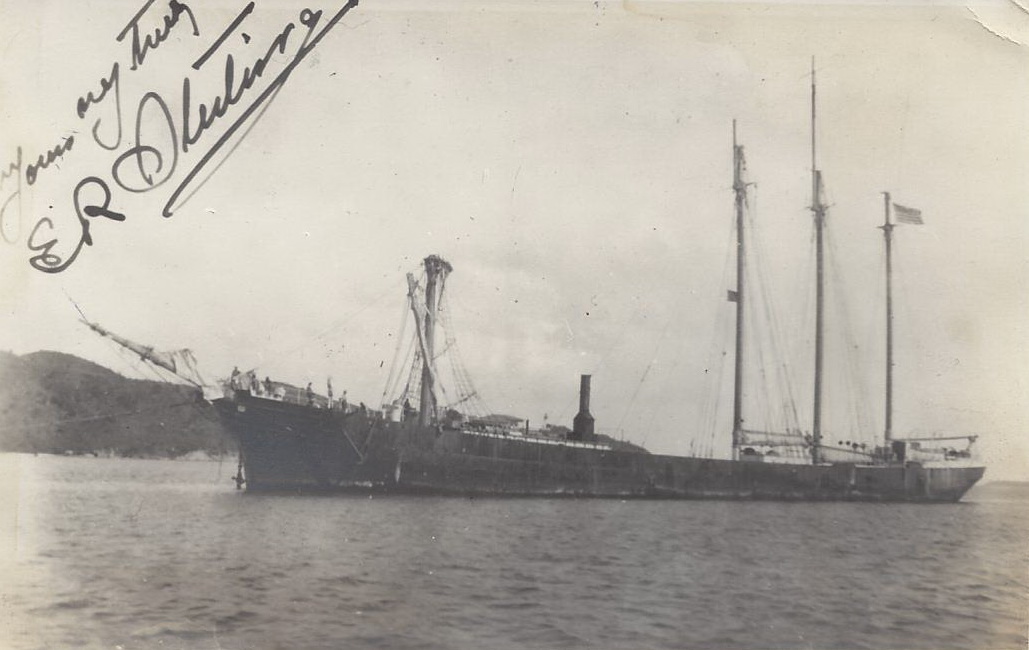 The E.R. Sterling was a American six-masted barquentine, built 1883 at Harland & Wolff, Belfast, as the four-masted ship Lord Wolseley. Lord Wolseley delivered to Irish Shipowners Co. (T. Dixon & Sons), Belfast. 1898 sold to J.C. Tidemann & Co., Bremen, was reduced to barque rig and renamed Columbia. 1904 sold to C.E. Peabody, Vancouver, was remasted and rerigged to a six-masted barkentine and renamed Everett G. Griggs. 1910 sold to E.R. Stirling, Blaine, WA, and was renamed E.R. Sterling. Broken up at Sunderland in 1928. (My gratitude to Bob for identifying the ship – details from commons.wikimpedia.org)