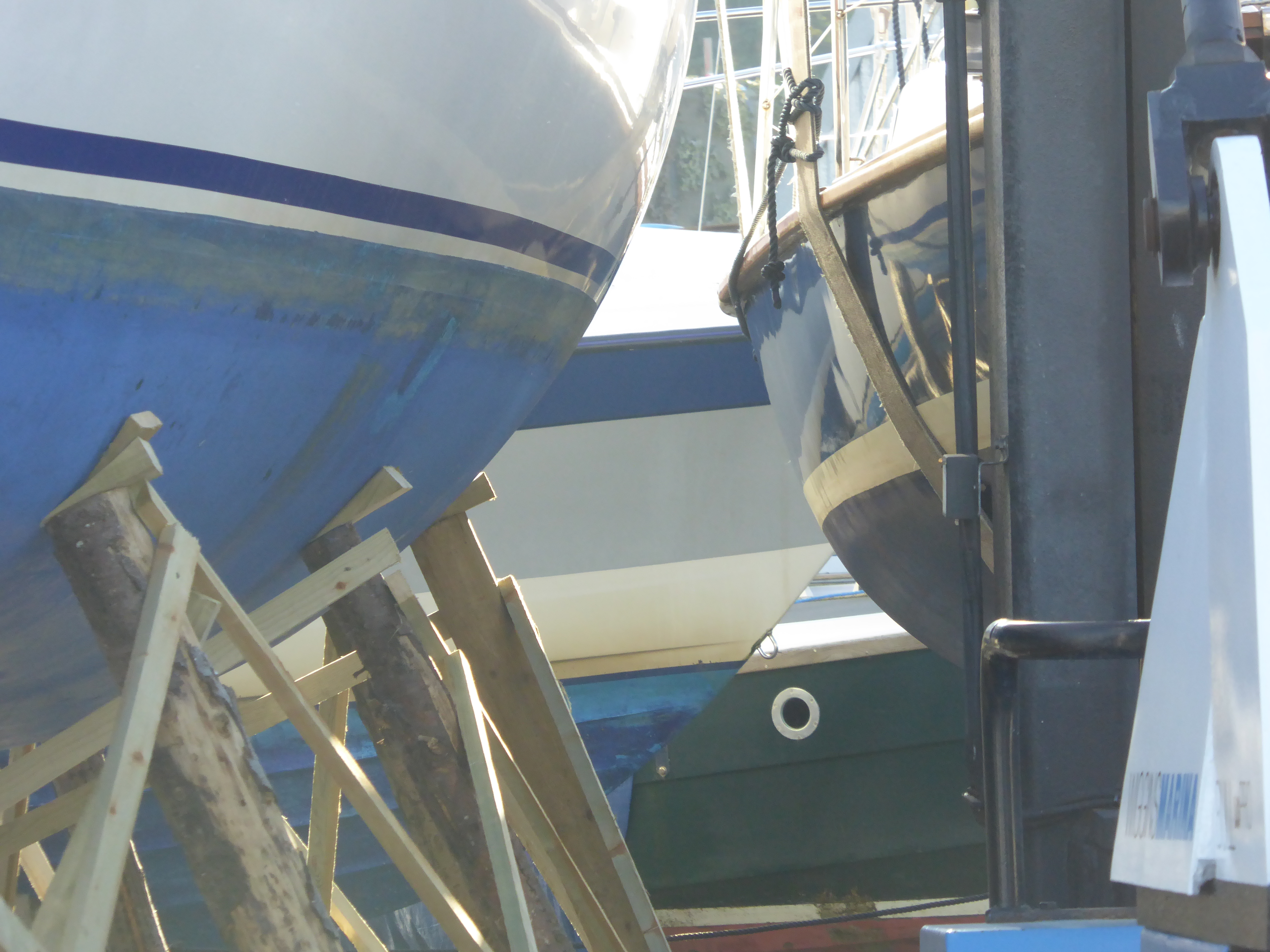 This seemed a good idea at the time because she would be protected from the worst of the winter weather but is proving awkward now because there is work to do on the rubbing strakes and access is poor.